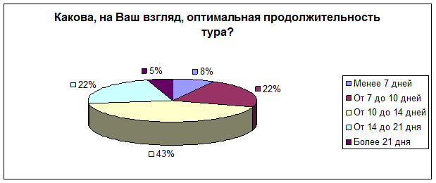 Большинство респондентов путешествуют 1 раз в год (45%), пятая часть респондентов (21%)- раз в 2-5 лет. Оптимальной продолжительностью тура 43% считают период от 10 до 14 дней, 22%- от 14 до 21 дня.