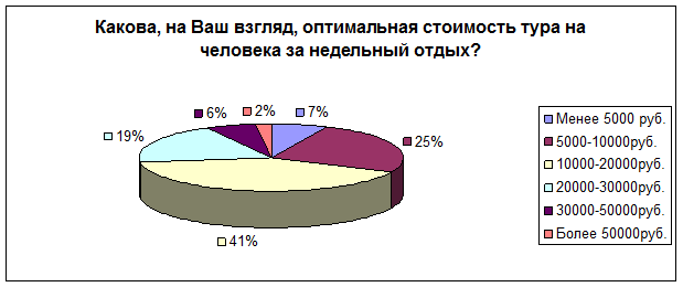 Чуть менее половины респондентов считают оптимальной продолжительностью тура 10-14 дней и готовы заплатить за недельный отдых 10000-20000 рублей.