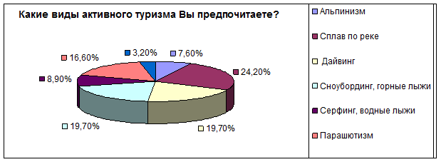 Из активных видов спорта наиболее популярными является сплав по реке (24, 2%), сноубординг, горные лыжи (19, 7%), дайвинг (19, 7%) и парашютизм (16, 6%).