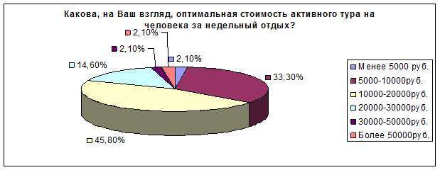 На недельный активный отдых 45, 8% респондентов согласны потратить от 10000 до 20000 рублей, треть опрошенных (33, 3%) от 5000 до 10000 рублей. Крупные суммы (более 30000 рублей) потребители в Кемеровской области платить не готовы.