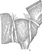 Рис. 69. Верёвочная повязка Дельварта для предупреждения выпадения влагалища и матки. Верёвочная повявка Дельварта состоит из двух длинных верёвок, соединённых между собою петлёй способом, показанным на рисунке 69.
