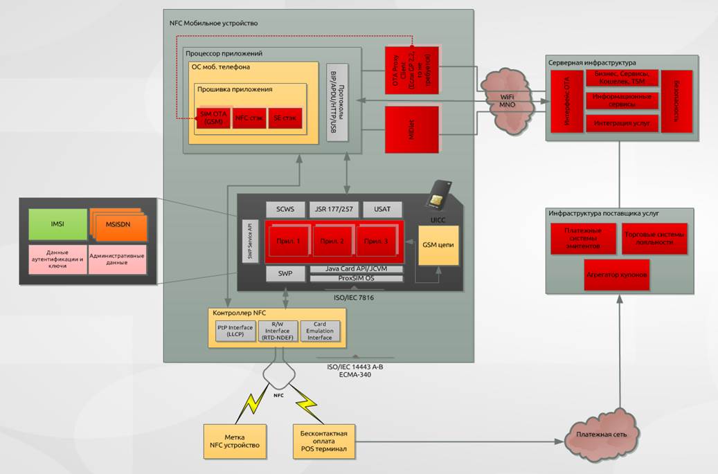 Обращение к элементу безопасности может происходить как с внешней стороны, так и с внутренней: 1. С внешней стороны обращение происходит при инициализации взаимодействия с ридером (бесконтактным считывающим устройством) контактным способом. 2. С внутренней стороны по стандарту ISO 7816 для контактных комплексных плат (смарт-карт). Обращение к элементу безопасности происходит в двух случаях: 1. При осуществлении функционала удаленного менеджмент элемента безопасности, с использованием сетевых интерфейсов телефона. 2. При осуществлении функционирования пользовательского интерфейса NFC приложения, размещенного в элементе безопасности. Элемент безопасности может одномоментно поддерживать только один режим работы: либо внутренний, либо внешний. Таким образом, элемент безопасности не может одновременно взаимодействовать и с внешним считывателем и с процессором телефона. Функционирование элемента безопасности во внешнем режиме регламентируется стандартами бесконтактного взимодействия (ISO 14443 1-4 A-B) или в рамках бесконтактных технологий (Mifare, Calypso, FeliCa). В зависимости от того, какие именно стандарты и технологии поддерживает конкретная имплементация NFC (NFC контроллер), и не зависит от конкретной реализации элемента безопасности в мобильном устройстве с точки зрения архитектуры. Функционирование элемента безопасности во внутреннем режиме определяется характером NFC архитектуры мобильного NFC устройства и осуществляется принципиально по-разному в зависимости от того, как именно реализован элемент безопасности. Функционирование элемента безопасности во внутреннем режиме также существенно определяется инструментами разработки NFC приложений, реализуемых в элементе безопасности. Архитектура системы, подразумевающей использование токена безопасности на основе технологии NFC в мобильных устройствах, состоит из четырех различных частей (участников), взаимодействующих безопасным способом, в том числе, возможно и при поддержке третьей доверенной стороны (TSM). Пример структуры SE на базе USIM (UICC) карты в мобильном устройстве.