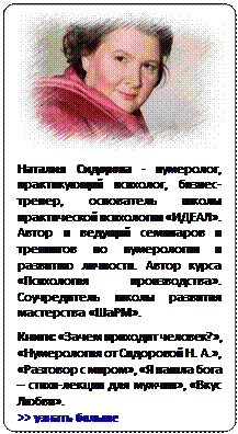 Наталия Сидорова применяет собственную интерпретацию метода Пифагора. Ее система использует нумерологический подход и дает полную картину ваших природных данных.