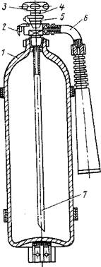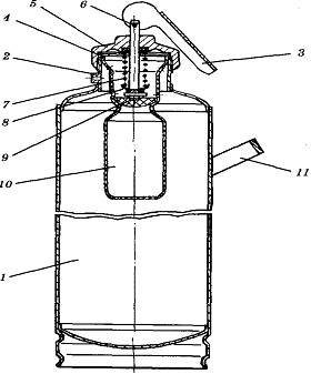 4.1.1 Хімічно-пінні вогнегасники ВХП-10 призначений для гасіння первинних осередків пожежі твердих матеріалів, а також різних горючих рідин на площі до 1 м2, за винятком електроустановок під напругою, речовин, здатних при взаємодії з водою (хімічною піною) вибухати, горіти. Промисловість випускає три види ручних хімічно-пінних вогнегасників – ВХП-10, ВП-М, ВП-9ММ. Цифра в маркуванні будь-якого типу вогнегасника вказує на об'єм корпусу вогнегасника. Будова ВХП складається з трьох основних елементів: корпус, запірно-пускова головка, кислотний циліндр (рис. 4.1). Хімічно-густопіний морський вогнегасник ВП-М призначений для гасіння займань на кораблях. Відрізняється від ВХП-10 тим, що внутрішня поверхня корпусу і пружина (запірно-пускового пристрою) (ЗПП) просвинцьовані. Хімічно-пінний маломагнітний вогнегасник ВП-9ММ (ОП-9ММ), крім вищевказаних конфігурацій ВХП, може використовуватись для гасіння електроустановок. Вогнегасник з низькою магнітною проникністю. Вміст заряду: - кислотна частина – суміш сірчанокислого заліза з сірчаною кислотою, відповідно 150 г і 120 г, всього 270 г; - лужна частина – бікарбонат натрію з екстрактом солодового коріння (NаНСO3 + е.с.к.) – 450 г. В результаті реакції кислотної та лужної частини виділяється СО2, під дією якого виділяються продукти реакції у вигляді піни. Якщо вогнегасник буде експлуатуватися при температурі 5 °С і нижче, то необхідно залити 3 л етиленгліколю, і температура зберігання понизиться до – 20...25 °С.