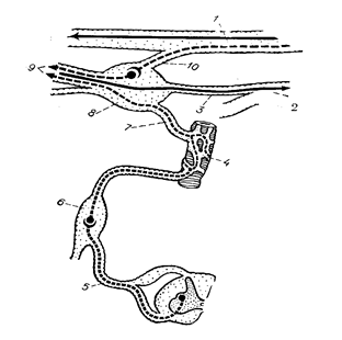 Большой каменистый нерв отходит на уровне узла коленца, покидает канал через одноименную расщелину и, располагаясь на передней поверхности пирамиды в одноименной борозде, доходит до верхушки пирамиды, где через рваное отверстие покидает полость черепа. В области этого отверстия он соединяется с глубоким каменистым нервом (симпатическим) и образует нерв крыловидного канала, n. canalis pterygoidei. В составе этого нерва преганглионарные парасимпатические волокна достигают крылонебного узла, ganglion pterygopalatinum, и заканчиваются на его клетках (рис. 15). Постганглионарные волокна от узла в составе небных нервов, nn. palatini, направляются в полость рта и иннервируют железы слизистой оболочки твердого и мягкого неба, а также в составе задних носовых ветвей, rr. nasales posteriores, иннервируют железы слизистой оболочки полости носа. Меньшая часть постганглионарных волокон достигает слезной железы в составе n. maxillaris, затем n. zygomaticus, анастомотической ветви и n. lacrimalis (рис. 14). Другая порция преганглионарных парасимпатических волокон в составе chorda tympani присоединяется к язычному нерву, n. lingualis, (из III ветви тройничного нерва) и в составе его подходит к поднижнечелюстному узлу, ganglion submandibulare, и оканчивается в нем. Аксоны клеток узла (постганглионарные волокна) иннервируют поднижнечелюстную и подъязычную слюнные железы (рис. 14). Парасимпатическая часть языкоглоточного нерва (IX пара) представлена нижним слюноотделительным ядром, nucl. salivatorius inferior, расположенным в ретикулярной формации продолговатого мозга. Преганглионарные волокна выходят из полости черепа через яремное отверстие в составе языкоглоточного нерва, а затем его ветви - барабанного нерва, n. tympanicus, который через барабанный каналец проникает в барабанную полость и вместе с симпатическими волокнами внутреннего сонного сплетения образует барабанное сплетение, где часть парасимпатических волокон прерывается и постганглионарные волокна иннервируют железы слизистой оболочки барабанной полости. Другая часть преганглионарных волокон в составе малого каменистого нерва, n. petrosus minor, выходит через одноименную щель и по одноименной борозде на передней поверхности пирамиды достигает клиновидно-каменистой щели, покидает полость черепа и вступает в ушной узел, ganglion oticum, (рис. 16). Ушной узел располагается на основании черепа под овальным отверстием. Здесь преганглионарные волокна прерываются. Постганглионарные волокна в составе n. mandibularis, а затем n. auriculotemporalis направляются к околоушной слюнной железе (рис.12). Парасимпатическая часть блуждающего нерва (X пара) представлена дорсальным ядром, nucl. dorsalis n. vagi, расположенным в дорсальной части продолговатого мозга. Преганглионарные волокна от этого ядра в составе блуждающего нерва (рис. 17) выходят через яремное отверстие и далее проходят в составе его ветвей до парасимпатических узлов (III порядка), которые располагаются в стволе и ветвях блуждающего нерва, в вегетативных сплетениях внутренних органов (пищеводном, легочном, сердечном, желудочном, кишечном, поджелудочном и др.) или у ворот органов (печень, почки, селезенка). В стволе и ветвях блуждающего нерва насчитывается около 1700 нервных клеток, которые группируются в мелкие узелки. Постганглионарные волокна парасимпатических узлов иннервируют гладкую мускулатуру и железы внутренних органов шеи, грудной и брюшной полост