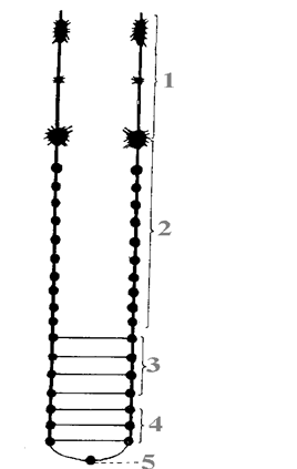 Белые соединительные ветви, rami communicantes albi, состоят из преганглионарных симпатических волокон, которые являются аксонами клеток промежуточно-латеральных ядер боковых рогов спинного мозга. Они отделяются от ствола спинномозгового нерва и входят в ближайшие узлы симпатического ствола, где часть преганглионарных симпатических волокон прерывается. Другая часть проходит узел транзитно и через межузловые ветви достигает более отдаленных узлов симпатического ствола или проходит к узлам II порядка. В составе белых соединительных ветвей проходят и чувствительные волокна - дендриты клеток спинномозгового узла. Белые соединительные ветви идут только к грудным и верхним поясничным узлам. В шейные узлы преганглионарные волокна подходят снизу из грудных узлов симпатического ствола через rami interganglionares (рис. 8), а в нижние поясничные и крестцовые - из верхних поясничных узлов также через межузловые ветви.