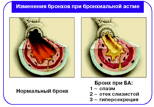 1. С учётом выполненных мероприятий доврачебной помощи выше места инъекции (укуса) наложить жгут; 2. Место инъекции (укуса) обколоть 0, 1%-0, 5 адреналином в 2-3 укола, приложить лёд, ещё 0, 5мл ввести в\м; 3. В\в преднизолон 90-120мг (150-200), повторять каждые 4часа; 4. Кордиамин п/к 2 мл или кофеин (для борьбы с сосудистым коллапсом); 5. Антигистаминные препараты; 6. При выраженном бронхоспазме 10 мл эуфиллина 2, 4%; 7. Симптоматическое лечение (сердечные, гликозиды, Эуфиллин, препараты кальция) 8. Госпитализация (транспортировка возможна только после купирования основных проявлений шока и нормализации АД). Профилактика. Перед введением лекарственного препарата проводить опрос на его переносимость. Наличие противошоковой аптечки. Обеспечить готовность противошокового набора в процедурном кабинете. Наличие программы противошоковой терапии в процедурном кабинете. Использование разовых шприцев и игл. Обучение больных правилам лекарственной терапии. Все больные, перенёсшие анафилактический шок, подлежат диспансерному учёту у аллерголога. 9.Бронхиальная астма, причины, клинические симптомы, оказание неотложной помощи. Бронхиальная астма - это аутоиммунное заболевание, основную роль в ее возникновении играют аллергены. Этиология. Наследственная предрасположенность, патология верхних дыхательных путей, заболевания бронхов и легких. Клиника. Основное проявление – приступ удушья, причина – бронхоспазм (рис.6). Приступ возникает внезапно, нередко начинается с заложенности в носу, стеснения в груди, сопровождается кашлем. Во время приступа больной занимает вынужденное положение тела – сидя с упором на руки. Одышка с затрудненным выдохом, дыхание шумное, слышное на расстоянии. Во время приступа пульс учащен, кашель с отхождением скудной вязкой мокроты, лицо одутловатое, вены набухшие.