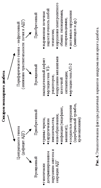 АП-2 — единственный водный канал, определяющий развитие некоторых форм патологии. Например, мутации человеческого гена АП-2 вызывают нефрогенный несахарный диабет. У ВП-дефицитной линии крыс Brattleboro (центральный несахарный диабет) наблюдается снижение экспрессии белка АП-2. При введении им экзогенного ВП количество АП-2 в апикальных мембранах клеток собирательных трубок значительно увеличивается. При застойной сердечной недостаточности, напротив, экспрессия АП-2 усиливается, что приводит к повышению реабсорбции воды в собирательных трубках и задержке ее в организме. В высокопроницаемом эпителии проксимальных канальцев и нисходящего сегмента петли Генле нефрона у млекопитающих (крыс, кроликов) имеется АП-1, участвующий в трансцеллюлярном перемещении воды в этих отделах почки. Мутации гена АП-1 не сопровождаются клиническими нарушениями. При активации V1-рецепторов ВП-м в качестве клеточного посредника выступает не цАМФ, а инозиттрифосфат, диацилглицерин, ионы Са. В клетках почечных канальцев они снижают эффект ВП, т. е. уменьшают транспорт ионов и воды. Роль гиалуронидазы в механизме действия АДГ в почке — увеличении проницаемости клеточной мембраны для воды (А. Г. Гинецинский, 1958) до настоящего времени остается окончательно не установленной, исследования в этом направлении продолжаются. Таким образом, ВП увеличивает проницаемость для воды клеток связующего отдела нефрона и собирательных трубок; в клетках толстого восходящего отдела петли Генле повышает реабсорбцию ионов Na, Ca, Mg; в клетках собирательных трубок коркового вещества почки стимулирует транспорт ионов Cl, а в клетках собирательных трубок наружного мозгового вещества почки усиливает реабсорбцию мочевины. Кроме того, ВП влияет на клубочковую фильтрацию вследствие повышения тонуса сосудов и сокращения клеток мезангия. Это приводит к уменьшению поверхности капилляров клубочков и снижает коэффициент гломерулярной ультрафильтрации. Таким образом, все эффекты ВП направлены на обеспечение максимальной реабсорбции осмотически свободной воды и осмотическое концентрирование мочи. Снижение секреции ВП лежит в основе синдрома несахарного диабета (рис. 4), характеризующегося полиурией (до 20 л в сутки и более), низкой плотностью мочи и полидипсией. Дефицит АДГ или снижение его эффективности описаны при ночном энурезе, которым страдают от 15 до 28% детей. Механизм его связывают с инвертированным ритмом секреции ВП: в отличие от нормы, секреция АДГ ночью не увеличивается, а напротив, снижается, что и обуславливает в итоге повышение ночного диуреза. Недавно выявлены и другие варианты патогенеза ночного энуреза, связанные с изменением эффекта АДГ под влиянием простагландинов. Повышение секреции вазопрессина. Синдром неадекватной секреции АДГ зависит от резкого повышения в крови уровня АДГ, что ведет к увеличению реабсорбции воды в почке и снижению осмоляльности крови ниже 280 мосм/кг H2О — гипоосмии. Несмотря на наличие гипонатриемии, моча у больных концентрируется. В большинстве случаев речь идет о нарушении осмотической регуляции секреции ВП.