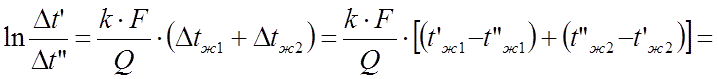 где Δ t’=t’ж1—t’ж2 и Δ t”=t”ж1—t”ж2 температурные напоры на входе и выходе из аппарата. Перепишем уравнение (12.22) в виде: