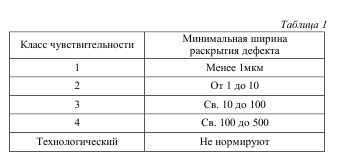 Чувствительность капиллярного контроля зависит от качества и правильности подбора дефектоскопических материалов. Поэтому все дефектоскопические материалы проходят предварительную проверку. Пенетрант проверяют на смачиваемость, вязкость и индикаторную способность. Проявитель проверяют на белизну по сравнению с баритовой пластиной. Порошковый и красящий проявители для люминесцентного контроля проверяют визуально в УФ лучах. Для комплексной проверки чувствительности различных методов дефектоскопии применяют стандартные образцы с искусственными дефектами. ГОСТ 23349-78 для оценки уровня чувствительности рекомендует применять натурные образцы объекта контроля или использовать образцы с инициированными трещинами. ГОСТ 18442-80 устанавливает 5 классов чувствительности по минимальной величине раскрытия выявляемых дефектов. Существуют 2 порога чувствительности - нижний и верхний. Нижний порог чувствительности характеризует дефекты минимальных размеров (ширины и глубины), которые могут быть выявлены данным методом. Верхний порог чувствительности характеризует максимальные размеры выявляемых дефектов. Дело в том, что у очень малых дефектов не хватает пенетранта для контрастной индикации проявителя, а у больших дефектов пенетрант удаляется в процессе устранения его излишков. Классификация осуществляется по нижнему порогу. Соответствие класса размерам выявляемого дефекта приведено в табл. 1.