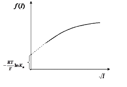 Экстраполируем затем полученную зависимость на нулевую ионную силу раствора, понимая, что при этом коэффициенты активности стремятся к единице и отрезок, отсекаемый на оси ординат будет связан с константой ионизации слабой кислоты. В следующем приближении после нахождения величины константы ионизации оценивают концентрацию ионов гидроксония по формуле