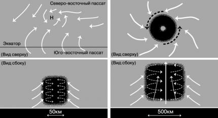 Антициклон зарождается в областях повышенного давления. В антициклоне воздух движется вниз и закручивается ускорением Кориолиса по часовой стрелке в северном полушарии (против часовой стрелки в южном полушарии). Для образования циклонов и антициклонов необходимо, чтобы ускорение Кориолиса было достаточно большим, поэтому они образуются на широтах выше ±5о. Самые мощные циклоны образуются в тропических областях всех океанов. Эти тропические циклоны наиболее часто (87% случаев) возникают в полосах широт ± (5° - 20°), где дуют пассатные ветры. В более высоких широтах они возникают лишь в 13% случаев. Тропические циклоны встречаются - в южной и юго-западной части Северной Атлантики (включая Карибское море и Мексиканский залив), - в северной части Тихого океана (к западу от мексиканского побережья, в районе Филиппинских о-вов и в Китайском море), - в Бенгальском заливе и Аравийском море, - в южной части Индийского океана у берегов Мадагаскара, - у северо-западного побережья Австралии, - в южной части Тихого океана – от побережья Австралии до 140о западной долготы. Никогда не отмечалось возникновение тропических циклонов севернее 35° и южнее -22°. Тропические циклоны, достигшие значительной интенсивности, в каждом районе имеют свое название. В восточной части Тихого океана и в Атлантике их называют ураганами (от испанского слова «уракан»), в странах полуострова Индостан – циклонами или штормами, на Дальнем Востоке – тайфунами (от китайского слова «тай», что означает сильный ветер). Есть и менее распространенные местные названия: «вилли-вилли» – в Австралии, «вилли-вау» – в Океании и «багио» – на Филиппинах. Тайфунам Тихого океана и ураганам Атлантики присваивают имена согласно установленным спискам. Для тайфунов используются четыре списка имен, для ураганов установлен один. Каждому тайфуну или урагану, образовавшемуся в данном календарном году, кроме имени присваивается порядковый номер двухзначная цифра года: например, 0115, что означает пятнадцатый по счету номер тайфуна в 2001. Тропические циклоны образуются над областями океана диаметром от 10 км до 3000 км, в которых температура поверхности воды выше 26°, а разность температур вода-воздух более 2°. Это приводит к усилению испарения воды, повышению концентрации паров воды в воздухе и более быстрому его нагреву по сравнению с соседними областями, где температура воды ниже. Нагретый воздух расширяется, и начинается его вертикальной подъем до высот 5 – 15 км. При подъеме происходит конденсация паров воды в облака. Вращение Земли придает подъему воздуха вихревое движение против часовой стрелки в северном полушарии и по часовой стрелке в южном полушарии.