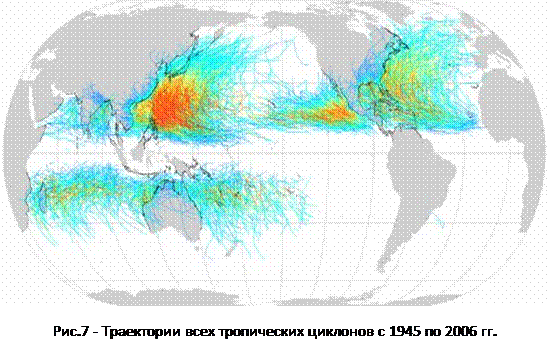 Тропические циклоны смещаются со скоростью 400 - 700 км/сут., существуют 5––15 дней, максимум до 5 недель, проходят за это время до 15 - 20 тыс. км, в том числе над сушей до 500 км, реже до 2000 - 2500 км, максимум - до 4000 км (от Мексиканского залива в Канаду). По мере удаления циклона от тропиков скорость его продвижения обычно возрастает и в отдельных случаях достигает 80 км/ч и более. Ежегодно возникает около 50 тропических циклонов, достигающих ураганной силы, в том числе около 20 в западной части Тихого океана с движением циклонов к восточным берегам Азии, вплоть до Камчатки, 14 - в Индийском океане с движением к южным берегам Азии и восточным берегам Африки, 7 - 8 - в Атлантике с движением к берегам Центральной Америки и США, вплоть до полуострова Лабрадор, 6 –– в восточной части Тихого океана с движением к западным берегам США. От года к году число тропических циклонов, зарождающихся в каждом районе, колеблется в пределах 50 %, среднее за ряд лет - в пределах 30 % с приблизительно 11-летней и более длинной ритмичностью. Территории России разрушительные циклоны Атлантики достигают относительно редко. Наиболее сильное воздействие западных циклонов проявляется в обильных осадках, ливневых наводнениях, буранах, снегозаносах и ощущается преимущественно в европейской части страны. Камчатка, Сахалин, Курильские острова в Приморье посещаются сильными тайфунами раз в несколько лет, слабыми - до 2 - 4 раз в год. Рекордная скорость ветра во Владивостоке - 65 м/с, довольно частая - более 40 м/с.