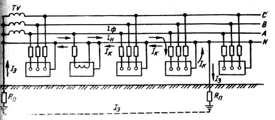 Рис. Принципова схема занулення: А, В і С — фазні проводи; N — нульовий провід; ТV — трансформатор; Rв — опір нейтралі трансформатора; Rп — опір повторного заземлювача; I3 — струм замикання на землю; Ік — струм короткого замикання; Zф і ZН — повні опори відповідно фазного і нульового проводів.