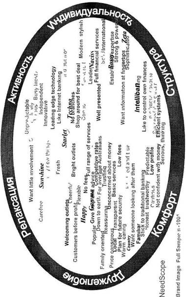 Для интерпретации положения марки на карте нам необходимо понимать потребности различных сегментов целевых покупателей. NeedScope™ Segmenter сегментирует покупателей на основе их представлений об идеальном продукте. Количество различных сегментов, которые могут существовать на рынке, определяется путем анализа характеристик, которые потребитель ассоциирует с " идеальным" продуктом. Приведенный на рис. 8 пример ниже демонстрирует характеристики, которые ассоциируются с нуждами потребителей, принадлежащих к сегменту испытывающих потребность в индивидуальности. По аналогии со " следами" марок на карте важность характеристики для сегмента (в абсолютном значении и в сравнении с другими сегментами) показана размером точек на карте. Следующий этап анализа, результаты которого представлены на рис. 9, дает более подробную информацию. Картинка на рис. 9 показывает характеристики, которые стимулируют потребление марки и которые важны для определенных сегментов. Для того, чтобы сохранить покупателей, следует усиливать данные характеристики. Также на данной диаграмме можно увидеть характеристики, которые важны для наших покупателей, но ассоциируются с маркой в незначительной степени. Их нужно развивать, чтобы привлечь покупателей. Очень редко стратегия продвижения марки нацелена только на один сегмент. В то время как один сегмент может рассматриваться как целевой, необходимо выявлять возможности для максимизации рыночного потенциала. Трудность состоит с том, чтобы определить характеристики марки, которые будут выбывать положительную реакцию у большинства потребителей и, одновременно, не ны.юнут негативном реакции у целе- 23 — 4-1131 Приложения