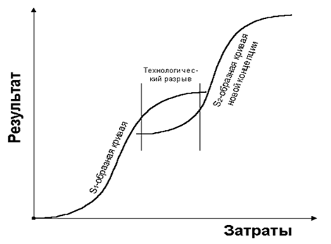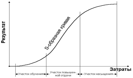 Термин «инновация» был введен экономистами И. Шумпетером и Г. Меншем в 1911 г. Производным является слово «новация» (от анг. novation), буквально – «новшество» или «нововведение». Инновация – это новация, которая сопровождается инвестициями. Иными словами, инновация – это нововведение, затраты на внедрение которого окупаются и дают прибыль. Техническая инновация – воплощение научного открытия или технического изобретения в конкретном материальном продукте или технологии его изготовления. Изобретение, вызывающее смех окружающих и приносящее убытки своему изобретателю, до статуса инновации не дотягивает. Большая часть таких изобретений умирает и забывается. Некоторые из них оживают и становятся инновациями через столетия. Темп нашей жизни все больше ускоряется, поэтому примеров, когда упорный и удачливый изобретатель обретает богатство и славу при жизни, становится все больше. Удача особенно нужна изобретателю на первой стадии развития инновации – стадии убытков и насмешек. Именно в это время надо найти еще хотя бы одного безумца, кто рискнет вложить средства в то, во что никто никогда денег не вкладывал. Начальная прибыль от нововведения даже близко не приближается к затратам. Если в это время изобретателям сообщить, что впоследствии они станут миллионерами, то они воспримут это как еще одну насмешку. Зато потом начинает казаться, что деньги рекой текут к удачливому бизнесмену, который может уже больше ничего не делать, а предаваться воспоминаниям о трудных временах и глупых людях. Все дело в том, что зависимость этого результата от затрат не является линейной, как это может сначала показаться, а имеет более сложный характер: каждый вложенный рубль (доллар, марка, фунт, иена) может давать прибыли на копейку, а может и на сто рублей. Если мы построим некий условный график зависимости результата от затрат, он будет иметь вид, напоминающий латинскую букву S. Поэтому этот график так и называется – S-образная кривая (рис.1).