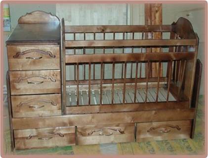 Кровать выполнена по конструкции «Решетка», снизу возможны ящики, люлька и комод.