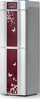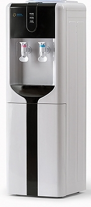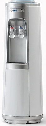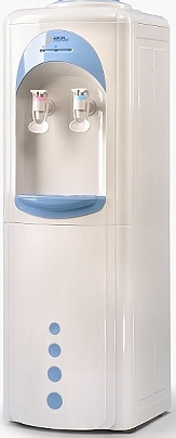 Кулер в первую очередь интересен своим неповторимым дизайном. Волнистая линия, разделяющая переднюю панель как будто на две части, окошко на дверце шкафчика, нестандартный каплесборник — все эти элементы декора отлично сочетаются с функциональностью кулера. Данный диспенсер оснащен тремя краниками подачи воды: холодной, комнатной температуры, горячей (с опцией защиты от ошпаривания); аппарат оборудован шкафчиком на 16л; электронное табло с функцией регулирования температуры. Напряжение/частота: 220-240В / 50 Гц. Размер: 320х360х1000, производительность горячей воды не менее 5 л/ч, температура нагрева > 90 º С, мощность нагрева 530 Вт. Охлаждение копрессорное, производительность холодной воды не менее 2л/ч, температура охлаждения – не более 8 º С, мощность охлаждения 110Вт, подача воды: рукой, вес 15 кг