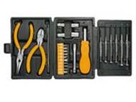 Набор инструментов из 22 предметов. В комплект входят длинногубцы, отвертка, переходник, удлинитель, две часовые отвертки, торцевые головки 8, 9, 10, 11, 12, 13, 14 мм и биты PH 1, PH 2, PZ 1, PZ 2, SL 5, SL 6, T 10, T 15, T 20.