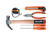 В комплект входят: молоток-гвоздодер с деревянной ручкой, нож 18 мм с выдвижным лезвием, пассатижи, отвертка с двухсторонним стержнем (PH №0 х 100 мм шлиц 3 х 100 мм), отвертка с двухсторонним стержнем (РН №2 х 100 мм шлиц 5 х 100 мм), рулетка 2 м.