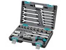Все инструменты изготовлены из инструментальной стали 40Х и оцинкованы. В комплект входят: трещоточный ключ, ключ с присоединительным квадратом, удлинители 125 и 150 мм, коловорот, шарнир, торцевые головки 10, 11, 12, 13, 14, 15, 17, 19, 22, 24, 27, 30 и 32 мм.