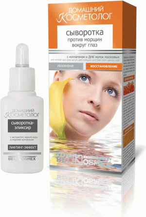 Активные компоненты: морской коллаген, экстракт черной икры. Сыворотка содержит интенсивный питательный комплекс для восстановления упругости и эластичности кожи и борьбы со старением, вызванным возрастными изменениями. Растворимый морской коллаген активно способствует увлажнению, регенерации и возмещению потери аминокислот в коже, а также обладает подтягивающим действием. Экстракт черной икры – богатейший источник витаминов и аминокислот – эффективно питает кожу, оказывает защитное действие, восстанавливает ее гладкость. В результате воздействия на кожу этого энергизирующего комплекса глубокие морщинки уменьшаются и словно " заполняются изнутри", значительно уменьшается проявление складок на лбу, носогубных складок и " гусиных лапок" вокруг глаз. Кожа лица преображается и выглядит значительно моложе. С ыворотка против морщин вокруг глаз с ДНК молок лососёвых и коллагеном 30 г. 35+ 200 руб.