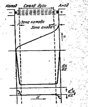 Рис. 1 – розподіл напруги, напруженості електричного поля й об’ємного зарядів в електричній дузі.