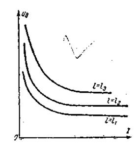 Рис.2 – Вольт-амперні характеристики дуги. об’ємний заряд, що створюється позитивними іонами. Між позитивним об’ємним зарядом і катодом створюється електричне поле, в якому рухаються електрони, що вийшли з катода. Сили електричного поля впливають на електрон і збільшують його швидкість. При зіткненні такого електрона з нейтральною частиною може відбутися іонізація. Для того щоб іонізувати нейтральний атом, необхідно, щоб електрон мав певну енергію. Напруга Ui (розганяюча напруга), яку повинен пройти електрон для набуття енергії, необхідної для іонізації, називається потенціалом іонізації. Для газів цей потенціал коливається від 24, 58 В (гелій) до 13, 3 В (водень). Пари металів мають значно менший потенціал іонізації. Так, для парів міді він становить 7, 7 В. Позитивні іони, як і електрони, розганяються електричним полем, але через велику масу швидкість їх незначна. При ударі позитивного іона з нейтральною частиною менша частина енергії передається на іонізацію, так що іонізація поштовхом відбувається в основному за рахунок електронів. Внаслідок малої протяжності білякатодної області електрони не набувають швидкості, достатньої для іонізації ударом. Частіше після удара атом переходить в збуджений стан (електрон атома переходить на більш віддалену від ядра орбіту). Для іонізації збудженого атома потрібна менша енергія. У результаті необхідний потенціал іонізації зменшується. Така іонізація називається ступеневою. При ступеневій іонізації необхідний багаторазовий удар електронів по атому: на кожний створюваний позитивний іон потрібно десятки електронів. Тому струм бідя катода, незважаючи на наявність позитивних іонів, має елекронний характер. Виникаючі електрони не створюють біля катода негативного об’ємного розряду, бо їх швидкість значно більша швидкості важких позитивних іонів. Позитивні іони розганяються в полі катодного падіння напруги і бомбардують катод. Завдяки цьому температура катода піднімається і досягає точки випаровування матеріалу катода. При високих температурах з’являється термоіонна емісія.