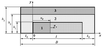 Физическая формулировка задачи заключается в следующем. Плоский слой единичной толщины высотой 2 h 1 и длиной l помещен в песчаную оболочку и стальную матрицу также единичной толщины. Размеры оболочки и матрицы известны. В начальный момент времени на торце слоя инициируется реакция горения с известной температурой горения Т г и скоростью горения u г. Объект моделирования представляет собой плоскую трехэлементную систему с областями конечных размеров и с внутренней подвижной границей первого рода (фронт горения). Между элементами системы происходит нестационарный теплообмен. Теплообмен продуктов синтеза с оболочкой и оболочки с инструментом осуществляется при граничных условиях четвертого рода с идеальным тепловым контактом. На границе «инструмент - окружающая среда» имеют место граничные условия третьего рода. Теплообмен на боковых гранях слоя, оболочки и матрицы отсутствует. Фронт горения считается плоским и адиабатическим. Требуется найти температурное поле системы трех соприкасающихся тел в произвольный момент времени t. На рис. 2.6 приведена расчетная схема трехслойной системы, состоящей из плоского слоя длиной l, теплоизолирующей оболочки 2 и пуансона 3 диаметром D = l + 2× l о мм. Горение слоя начинается с левой торцевой плоскости (x 0 = 0); плоский фронт горения движется с постоянной скоростью u г в направлении оси х. В силу осевой симметрии рассматривается половина высоты слоя в декартовых координатах х и у.