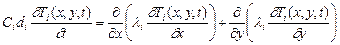 При расчете температурного поля после сгорания всего слоя из системы уравнений (2.15)-(2.20) исключаются уравнения (2.18)-(2.20) и добавляются граничные условия четвертого рода на правой торцевой поверхности слоя при х = l: l 1 В уравнениях (2.15)-(2.23) обозначено: Тi – температура тел; Сi, di, li – удельная теплоемкость, гравиметрическая плотность и коэффициент теплопроводности тел системы; hi – характерные размеры тел (см. рис. 2.6); i – индекс тела системы: 1 – продукты синтеза, 2 – оболочка, 3 – пуансон; t – время; х г – текущая координата фронта горения; a т – коэффициент теплоотдачи; ТS – температура среды; n – нормаль к граничной поверхности. Поставленная задача нестационарного теплообмена может быть решена только численным методом. В первой главе отмечалось, что среди численных методов решения краевых задач математической физики наиболее эффективным является метод конечных элементов (МКЭ). Теория и практическое применение МКЭ к различным задачам теплофизики и механики деформируемых твердых тел подробно изложены в обширной научной литературе [53, 65, 123, 130, 152, 171, 196, 227]. При решении задач механики деформируемых твердых тел рассматривается вариационная интерпретация МКЭ. Не все задачи тепломассопереноса допускают свое представление в вариационной форме, и для этого класса задач используется формулировка Галеркина [217]. В нашем случае нестационарные уравнения теплопроводности (2.14) с граничными условиями (2.15), (2.16) допускают вариационную формулировку, и им можно поставить в соответствие функционал Дьярмати следующего вида [48]: