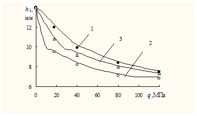 Традиционно в качестве материала сыпучей оболочки используется песок. Вместе с тем научный и практический интерес представляет изучение влияния реологических свойств материала оболочки на закономерности уплотнения и формообразования заготовки. Исходя из функционального назначения материал оболочки должен быть хорошим теплоизолятором, иметь высокую огнеупорность, а также быть доступным и относительно дешевым. Этим требованиям вполне отвечают алюмосиликатные огнеупоры и, в частности, шамот. Важным свойством шамотной крошки является то, что она имеет более низкую, чем песок, начальную плотность r20: у песка r20 = 0, 61, у шамотной крошки r20 = 0, 41 [206]. Соответственно ресурс сжимаемости у шамотной крошки выше, чем у песка, и это должно оказать положительное влияние на процесс деформирования заготовки. В работе [163] проведены теоретические и экспериментальные исследования влияния материала оболочки на закономерности уплотнения и формообразования заготовки. В качестве материала оболочки были исследованы песок, шамотная крошка и их смесь: 3 объемные части песка и 1 часть шамотной крошки. Рассматривалось СВС-прессование заготовок радиусом R 1 = 39 мм из твердого сплава TiC-20% Ni в пресс-форме радиусом 62, 5 мм. Служебные характеристики материалов оболочки приведены в подразд. 3.4. Экспериментальные данные и результаты расчета высоты центра заготовки h 1 в зависимости от давления прессования q приведены на рис. 5.21. Здесь же представлены результаты расчета средней по объему относительной плотности заготовки r1. Реологические свойства материала оболочки оказывают заметное влияние на кинетику уплотнения продуктов синтеза. Так, уплотнение продуктов синтеза в шамотной оболочке требует меньшего давления прессования q, чем в песчаной оболочке. В результате максимальная степень уплотнения продуктов синтеза в шамотной оболочке достигается при меньшем давлении, чем в песчаной оболочке: соответственно при q = 95 МПа и q = 120 МПа. Прессование в оболочке из смеси шамотной крошки с песком по кинетике уплотнения занимает промежуточное положение.