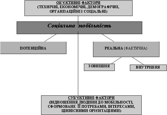 Вертикальна соціальна мобільність — сукупність взаємодій, що сприяють переходу індивіда або соціального об'єкта з одного соціального прошарку в іншій. Горизонтальна соціальна мобільність означає, що при змінах у житті людини її соціальний статус не змінюється, вона ніби переміщається в тій самій площині, що й раніше (горизонтально), наприклад, при зміні місця роботи залишається на тій же посаді. Основні елементи механізму соціальної мобільності та їх взаємозв’язки зображено на схемі: Механізм соціальної мобільності: