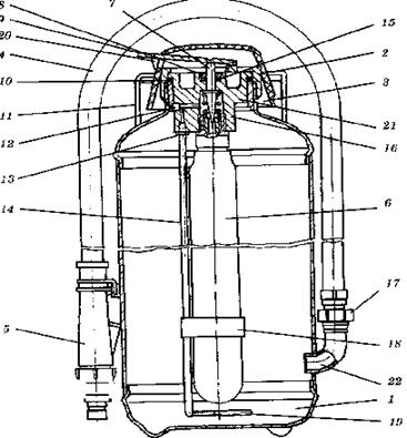 Порошкові вогнегасники Існують ручні вогнегасники марок ВП-2, ВП-2А, ВП-8Б, ВП-5, ВП-10; пересувні ВП-100; стаціонарні ВП-250 і комбіновані ВК-100. Всі вони призначені для гасіння загорянь різноманітних твердих матеріалів і речовин, луго-земельних металів, електроустановок під напругою до 1000 В. Залежно від марки і призначення вогнегасника, вони можуть застосовуватися при температурі навколишнього повітря в межах від –50 до +50º С. За будовою і принципом роботи порошкові вогнегасники схожі. Цифри в маркуванні означають місткість корпусів. У вогнегасниках ємністю 2л і більше корпуси виготовляють з листової сталі. Ручні вогнегасники забезпечені запірно-пусковими пристроями підйомового типу, а ВП-5 і ВП-10 – шлангами довжиною 0, 6м і 0, 8м відповідно, на кінцях яких є стволи для викидання порошку під тиском робочого газу. Вогнегасник ВП-5 (рис. 5) за будовою і приведенням в дію аналогічний вогнегаснику ВПП-10, але в ньому насадка для одержання піни замінена коротким сприском щілинного типу, змонтованим на кришці вогнегасника, і використаний аерозольний засіб витиснення порошку. Вуглекислий газ із балончика при пуску вогнегасника подається по спеціальній трубці під аероднище – подвійне гратчасте дно. При цьому порошок, розміщений у корпусі, спучується і видавлюється по сифонній трубці до сприску. Аерозольний струмінь, що утворюється, надходить у зону горіння. Технічні дані порошкових вогнегасників