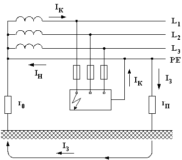 Рисунок 1 - Принципиальная схема зануления Иными словами, занулением называется преднамеренное электрическое соединение нетоковедущих металлических частей электроустановки, которые могут оказаться под напряжением вследствие замыкания фазы на корпус, с заземленной нейтральной точкой обмотки источника тока. Это соединение осуществляется с помощью нулевого защитного проводника (PE-проводника). Наиболее широкая область применения зануления – трехфазные четырехпроводные сети напряжением до 1000 В с глухозаземленной нейтралью). Принципиальная схема зануления показана на рис. 1.