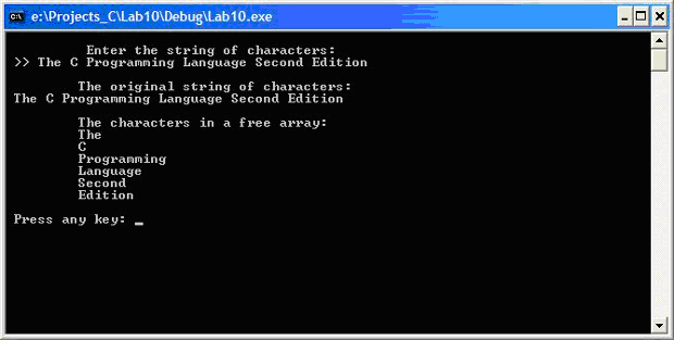 Рис. 12.4. Максмин двухмерного массива Пример 12.6. Напишите программу выделения слов из символьной строки, когда слова в ней разделены пробелами, и поместите каждое слово в отдельной строке свободного (вспомогательного массива). Программный код решения примера: #define _CRT_SECURE_NO_WARNINGS#include < stdio.h> #include < conio.h> #include < stdlib.h> #include < string.h> #define N 123#define M 40 int wordstr(char *c, char **FA) {int Ln, n = 0, i = 0; char *wr; char *tempstr; Ln = strlen(c); tempstr = (char *)calloc(Ln + 1, sizeof(char)); strcpy(tempstr, c); wr = strtok(tempstr, " "); Ln = strlen(wr); FA[i] = (char *)calloc(Ln + 1, sizeof(char)); strcpy(FA[i++], wr); n++; while (wr = strtok(NULL, " ")) {Ln = strlen(wr); FA[i] = (char *) calloc(Ln + 1, sizeof(char)); strcpy(FA[i++], wr); n++; }free(tempstr); return n; } int main (void) { int i, n; char *Farr[M]; char str[N]; printf(" \n\t Enter the string of characters: \n > > "); gets_s(str, N-1); printf(" \n\t The original string of characters: \n"); printf(" %s\n", str); //Обращение к функции обработки строки n = wordstr(str, Farr); //Распечатка слов, помещенных в свободный массив printf(" \n\t The characters in a free array: "); for (i = 0; i < n; ++i) printf(" \n\t %s", Farr[i]); //Освобождение памяти, занятую выделенными словами for (i = 0; i < n; ++i) {free(Farr[i]); Farr[i] = NULL; } printf(" \n\n Press any key: "); _getch(); return 0; }В программе использована библиотечная функция strtok(), которая выделяет слова из строки. При этом для каждого выделенного слова получаем динамическую память с помощью функции calloc(). Адрес выделенной памяти помещаем в соответствующий указатель массива свободных строк FA[]. Обратите внимание, что в функции calloc() вводится число на единицу больше, чем длина строки. Это сделано для учета символа завершения строки (или одного слова), т.е. для символа " \0" Для исключения предупреждений о безопасной работе с функциями strcpy(), strtok() в MS Visual Studio в программе используется директива #define _CRT_SECURE_NO_WARNINGS. Результат выполнения программы показан на рис. 12.5.