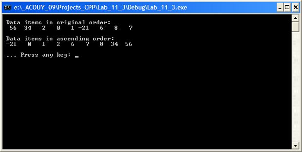 Пример 12.8. Напишите программу с функцией пузырьковой сортировки, использующей вызов по ссылке. В условии примера " вызов по ссылке" означает, что в качестве фактических параметров функций будут использоваться адреса переменных. И в этом случае прототип таких функций будет содержать указатели на соответствующие типы. Программный код решения примера: #include < stdio.h> #include < conio.h> // Прототип функцииvoid bsort (int* const, const int); int main (void) { int A[] = {56, 34, 2, 0, 1, -21, 6, 8, 7}; int i, n; //Размерность массива n = sizeof(A)/sizeof(A[0]); puts(" \n Data items in original order: "); for (i = 0; i < n; i++) printf(" %3d", A[i]); // Вызов функции сортировки - bsort() bsort (A, n); puts(" \n\n Data items in ascending order: "); for (i = 0; i < n; i++) printf(" %3d", A[i]); printf(" \n\n... Press any key: "); _getch(); return 0; } // Определение функцииvoid swap(int *pa, int *pb){int temp; temp = *pa; *pa = *pb; *pb = temp; } void bsort (int *const arr, const int size){int pass, //счетчик проходов j; // счетчик сравнений// Прототип функции обмена - swap()void swap (int*, int*); // Цикл для контроля проходовfor (pass = 0; pass < size - 1; pass++) { // цикл для контроля сравнений на данном проходе for (j = 0; j < size - 1; j++) { // обмен значений при нарушении порядка возрастания if (arr[j] > arr[j + 1]) { swap(& arr[j], & arr[j+1]); } }} }В программе функция сортировки bsort() в качестве формального параметра используется константный указатель, который указывает на первый элемент заданного массива. Второй формальный параметр также константный, чтобы подчеркнуть неизменность этого параметра в теле функции bsort(). Передача функции размера массива в качестве параметра имеет два преимущества – это хороший стиль программирования и, кроме того, такую функцию можно использовать многократно. Прототип функции swap() включен в тело функции bsort(), потому что это единственная функция, которая вызывает функцию обмена swap(). Пример выполнения программы показан на рис. 12.7.