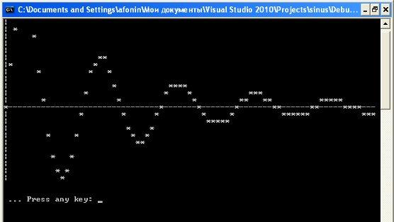 Предусмотрите возможность записи в текстовый файл графика данной функции. Для решения примера используем средства вывода на печать форматированных данных без применения специальных графических библиотек. Программный код решения примера: / Заголовочные файлы#include < stdio.h> #include < conio.h> #include < stdlib.h> #include < math.h> // Размеры диаграммы по ширине и высоте экрана#define SCREENW 79#define SCREENH 25 // Функция построения графика заданной функцииvoid plot (FILE *fout, double a, double b, double (*f) (double)){// Формальные параметры функции plot// FILE *fout – указатель на поток вывода // double a – левая граница оси абсцисс// double b – правая граница оси абсцисс// double (*f) (double) – указатель на функцию char screen[SCREENW][SCREENH]; double x, y[SCREENW]; double ymin = 0, ymax = 0; double hx, hy; int i, j; int xz, yz; // hx – шаг по оси абсцисс hx = (b - a) / (SCREENW - 1); for (i = 0, x = a; i < SCREENW; ++i, x += hx) { // вычисляем значение функции y[i] = f (x); // запоминаем минимальное и максимальное значения if (y[i] < ymin) ymin = y[i]; if (y[i] > ymax) ymax = y[i]; } hy = (ymax - ymin) / (SCREENH - 1); yz = (int)floor (ymax / hy + 0.5); xz = (int)floor (-a / hx + 0.5); // рисование осей координат for (j = 0; j < SCREENH; ++j) { for (i = 0; i < SCREENW; ++i) { if (j == yz & & i == xz) screen[i][j] = '+'; // '.', '? ', '+' else if (j == yz) screen[i][j] = '-'; else if (i == xz) screen[i][j] = '|'; else screen[i][j] = ' '; } } // рисование графика функции for (i = 0; i < SCREENW; ++i) { j = (int)floor ((ymax - y[i]) / hy + 0.5); screen[i][j] = '.'; // символ начертания графика } // вывод результата в файл или в стандартный поток stdout for (j = 0; j < SCREENH; ++j) { for (i = 0; i < SCREENW; ++i) fputc (screen[i][j], fout); fprintf (fout, " \n"); } } // Заданная функцияdouble f (double x){ return sin (3.0*x) * exp (-x / 3.0); //return x * x - 3; } int main (void) { // Вывод графика в стандартный поток (консоль) plot (stdout, 0.0, 10.0, f); printf(" \n\n … Press any key: "); _getch(); return 0; }В программе используется указатель на файл, который может быть стандартным потоком, т. е. экран дисплея. В главной функции main() происходит обращение к функции рисования графика plot(), в которую вводят фактические параметры, в частности файл – это stdout, т. е. стандартный поток, 0.0 – это левая граница оси абсцисс, 10.0 – правая граница оси абсцисс, f – имя функции с описанием зависимости y = f(x). Пример выполнения программы показан на рис. 12.11.