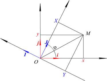 Равенство Выпишем выражения для коэффициентов Отметим, что 1.6.2.Преобразование сдвига Рассмотрим две системы декартовых координам с общим началом в точке O, полученные сдвигом одна относительно другой. Орты осей обозначим i, j встарой системе координам x, y и I, J в новой системе координат X, Y. Таким образом, для точки плоскости M будем иметь (см. рис. 1.22):
