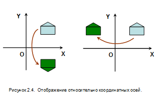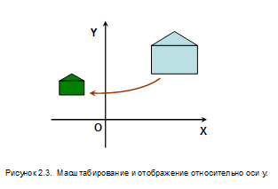 Для обращения преобразования необходимо произвести масштабирование с коэффициентами, обратными заданным. Обратная матрица представляется следующим образом: S-1 = Интересный эффект возникает при разрешении отрицательных значений коэффициентов в матрице масштабирования. В этом случае, наряду с масштабированием происходит отображение объектов относительно различных осей. Положим Sx = -2, а Sy = 1. S=