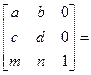 В рамках новой схемы мы легко можем представить как все рассмотренные ранее преобразования (для этого необходимо обнулить коэффициенты m и n), так и преобразование переноса. Коэффициенты m и n собственно и определяют величины перемещения по осям x и y. Матрица переноса представляется следующим образом: D = где dx и dy как уже говорилось, проекции вектора переноса. Р*D =[x y 1] Для обращения преобразования необходимо выполнить перенос на те же величины, но в противоположном направлении. D = Обратите внимание. Начало координат не является инвариантным к преобразованию переноса. Все определенные ранее матрицы преобразований легко приводятся к размеру 3*3. Добавляем строку и столбец, заполненные нулями, а затем в главную диагональ, на место их пересечения ставим 1. S =