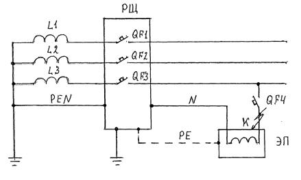Рисунок 1 – Действие защитного автоматического отключения питания и зануления При отсутствии повреждений изоляции электрической сети и ЭП электроснабжение осуществляется в рабочем порядке по выше приведенной схеме. Аварийный режим – пробой изоляции фазного провода на корпус ЭП (точка К). В этом случае на корпусе ЭП по отношению к земле появляется напряжение, равное замкнутой фазе L3. Для промышленных электрических сетей до 1 кВ с глухозаземленной нейтралью оно будет равно 220 В. АВ QF4 не отключится, так как отсутствует путь для протекания тока короткого замыкания. ЭП будет работать в обычном режиме, но на корпусе по отношению к земле будет напряжение в 220 В. При прикосновении человека к корпусу ЭП в этот момент через него на землю будет протекать ток величиной