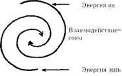Человеческое тело уравновешено энергетически и структурно. Оно также уравновешено биохимически, благодаря способности к гомеостазу. С энергетической точки зрения, энергетическое равновесие в теле поддерживают две противоположные силы, из которых одна, действуя сверху, тянет организм вверх, а другая, действующая снизу, тянет организм вниз Снова в качестве метафоры мы используем дерево. Его ветви тянутся вверх, к Солнцу, тогда как корни уходят в Землю. В традиционной китайской философии эти две силы, называемые инь и ян, представляют, соответственно, энергии Земли и Солнца. Корни растения поглощают энергию инь из Земли, а листья поглощают энергию ян от Солнца. В даосской мысли инь и ян находятся между собой в гармонии. Но жизнь не статична, она находится в состоянии постоянных изменений, благодаря взаимодействию этих двух сил, которые как бы постоянно перетягивают канат. Гармонией является срединный пункт в движении маятника, который существует только в тот момент, когда движение изменяет направление. Жизнь развилась на поверхности Земли там, где ее энергия реагировала и соединялась с энергией Солнца. Для возникновения жизни такое единство противоположностей является основой половой репродукции. У китайцев эти противоположности ориентированы сексуально: инь становится женским первоэлементом, а ян — мужским. Чтобы понять эти взаимодействия между противоположными энергетическими силами, нам необходимо введенное Вильгельмом Райхом понятие суперимпозиции или наложения, означающее две энергетические волны, кружащиеся вокруг центра в творческом акте. (Wilhelm Reich " Cosmic Superimposition" Rangeley, 1951.) Этот процесс представлен на рисунке 8.1.