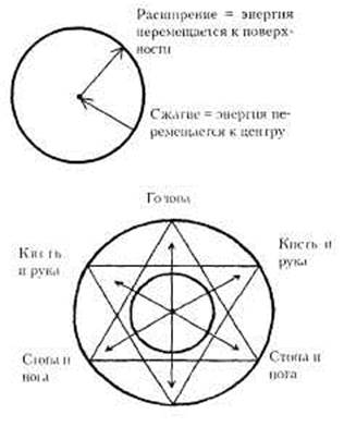 Рис 8.3- Процессы расширения и сжатия происходящие в теле Рисунок 8 ЗБ показывает тело, уподобленное шестиконечной звезде, где голова, руки, ноги и гениталии представляют шесть ее лучей. На эти фигуры можно наложить две концентрических окружности, из которых одна соприкасается со всеми внешними лучами, а вторая — со всеми