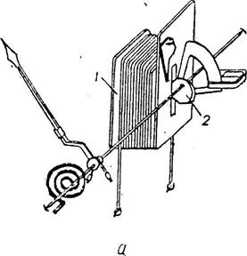 Рис. 2 со стальным сердечником. У приборов с плоской катушкой (рис.2) при прохождении тока по катушке 1 сердечник 2 намагничиваясь, втягивается в щель. Ось вращения, на которой жестко крепится стрелка прибора и спиральные пружины, расположена эксцентрично относительно сердечника, поэтому сила F, с которой будет