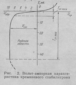 Особенностью р — п перехода кремниевого стабилитрона является то, что при напряженности электрического поля примерно 250000 В/см в нем происходит лавинообразное разрушение валентных связей, в результате чего проводимость диода в обратном направлении резко возрастает, поэтому увеличение силы обратного тока на несколько порядков происходит почти при постоянном обратном напряжении. Выбор кремния в качестве материала для диода определяется тем, что проводимость у кремния при номинальной температуре много ниже, чем у германия, и, следовательно, сила тока насыщения Iнас меньше. Благодаря малой силе тока насыщения при пробое не происходит саморазогрева диода и лавинный пробой не переходит в тепловой. Характеристика диода в области пробоя не имеет падающего участка, наоборот, с ростом силы тока, протекающего через диод, напряжение на нем несколько возрастает. Так, например, для стабилитрона Д813 при изменении силы тока от 5 до 20 мА напряжение стабилизации изменяется от 13 до 13, 6 В. Напряжение стабилизации кремниевого стабилитрона определяется напряжением пробоя. Рабочий участок на вольт -амперной характеристике (рис. 2) ограничен минимальными и максимальными допустимыми токами. Iст mах определяется допустимой для прибора мощностью рассеяния, Iст min — началом устойчивого пробоя. Параметрами стабилитрона являются: напряжение стабилизации Uст; максимальные и минимальные силы тока стабилизации для кремния, (I Ст ном = 5 мА при t° = 20°C); дифференциальное (динамическое) сопротивление в области стабилизации напряжения