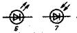 Рис.2 а: Условное графическое изображение диодов (6-излучающий диод, 7-фотодиод). Излучающий диод – полупроводниковый диод, излучающий из области p-n-перехода кванты энергии. Излучение испускается через прозрачную стеклянную пластину, размещенную в корпусе диода. Фотодиод – полупроводниковый прибор, принцип действия которого основан на использовании внутреннего фотоэффекта – генерации в полупроводнике под действием квантов света (фотонов) свободных носителей заряда. Фотодиод используют для преобразования светового излучения в электрический ток.