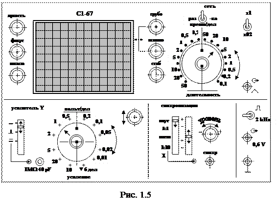На рис. 1.5 изображена панель осциллографа С1-67. Здесь же указаны названия ручек управления, по которым (названиям) можно судить об их назначении. Назначения ручек управления указаны также в табл. 1.1.