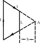 Рисунок 8 16. Два прямолинейных бесконечно длинных проводника расположены перпендикулярно друг другу и находятся в одной плоскости. Найти индукцию магнитного поля в точке, удаленной на расстояние r1 от первого проводника с током I 1 и расстояние r2 от второго проводника с током I 2 . 17. Ток I = 20 А идет по длинному проводнику, согнутому под прямым углом. Найти напряженность магнитного поля в точке, лежащей на биссектрисе этого угла и отстоящей от вершины угла на расстояние r =10 см. 18. Два длинных прямых провода с током пересекаются под углом α. Найдите индукцию магнитного поля на прямой, проходящей через точку пересечения проводов перпендикулярно им обоим. Токи в проводах равны I1 и I 2. 19. Замкнутая цепь с током I включает в себя прямолинейный участок длиной 2 а. Точка Р лежит на расстоянии d от этого участка на перпендикуляре, проходящем через его середину. Определите ту часть магнитной индукции В в точке Р, которая создается данным участком. 20. Чему равна магнитная индукция В в центре равностороннего треугольника со стороной а и током I? 21. Определите индукцию и напряженность магнитного поля в точке пересечения диагоналей проволочной квадратной рамки со стороной а = 10 см, если по рамке проходит ток I = 2A. 22. По тонкому проводу, изогнутому в виде прямоугольника, течет ток I. Стороны прямоугольника равны а и в. Какова индукция магнитного поля в точке пересечения диагоналей прямоугольника? 23. Найти индукцию магнитного поля в центре контура, имеющего вид прямоугольника, если его диагональ d = 16 см, угол между диагоналями α = 30° и ток в контуре I = 5 А. 24. Ток I = 6, 28 А течет в контуре, имеющем форму равнобочной трапеции. Отношение оснований трапеции равно 2. Найти магнитную индукцию В в точке А, лежащей в плоскости трапеции. Меньшее основание трапеции L = 100 мм, расстояние b = 50 мм. Контур изображен на рисунке 9.