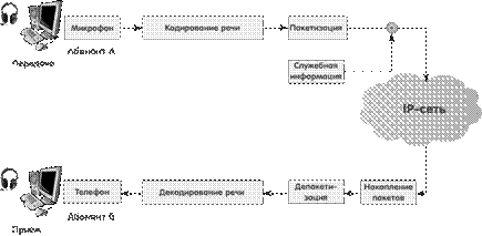 В качестве терминала сети NGN может использоваться любое оконечное устройство, преобразующее пользовательские данные в пакеты сети NGN и организующее двусторонний мультимедийный сеанс связи с помощью протоколов H.323 или SIP. В терминале, подключенном к сети NGN и оснащенном микрофоном, телефоном и программно-аппаратными средствами соединения по сети NGN, происходит кодирование речевого сигнала, поступающего от микрофона, включающее в свои функции: - АЦП-преобазование сигнала; - компрессию сигнала (для уменьшения требуемой полосы пропускания). Эти преобразования выполняются в кодерах. Обратные преобразования реализуются в декодерах; обычно в декодерах, производится также генерация комфортного шума, борьба с джиттером, подавление эха. Кодеки, объединяющие функции кодеров и декодеров, могут обеспечивать скорость передачи речи от 1.2 до 64 кбит/c. Для формирования пакетов необходимо накопить определенный объем данных, к которым добавляется служебная информация — адрес получателя, порядковый номер пакета на тот случай, если будет нарушена очередность доставки пакетов, и дополнительные данные для коррекции ошибок. Поскольку стек протоколов UDP/IP оказывает услугу передачи пакетов без установления соединения, пакеты со старшими порядковыми номерами могут прийти раньше, более того, интервал времени между пакетами также может колебаться. На приеме, для восстановления исходной очередности и выравнивания интервалов между принятыми пакетами, происходит накопление пакетов. Затем удаляются все заголовки шума, полученная последовательность данных декомпрессируется и подвергается ЦАП.