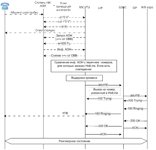 Рисунок 5‑ 22 После успешной регистрации на IMS-ядре, модуль MPN.SSBС получает посредством сообщения NOTIFY, получает информацию от IMS-ядра о наличии у данного абонента подключенных услуг. При заказе услуги НоtLine, он выделяет из этого сообщения данные об услуге: телефонный номер, на который требуется направить автоматический вызов и параметр timeout – задержку перед инициированием вызова после снятия трубки. Далее MPN.SSBC сохраняет эти данные в профиле указанного абонента и передаёт их модулю MPN.ITG. В случае перерегистрации, изменения статуса или параметров услуги происходит обновление данных посредством того же сообщения NOTIFY. За реализацию HotLine-вызова, отвечает модуль MPN.ITG. Во всех остальных случаях MPN.SSBC выполняет роль маршрутизатора сообщений о заказе/отмене/проверке определённой услуги. MPN.SSBC не хранит данных о том, какие услуги ДВО подключены у абонентов. Вызов пересылается в сторону IMS-ядра, которое, в свою очередь, определяет дальнейшее прохождение вызова. 5.3.13. Сценарий установления трёхсторонней конференции
